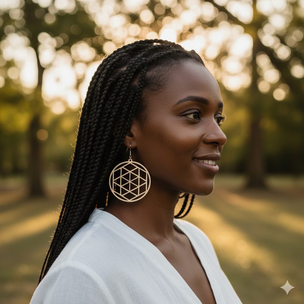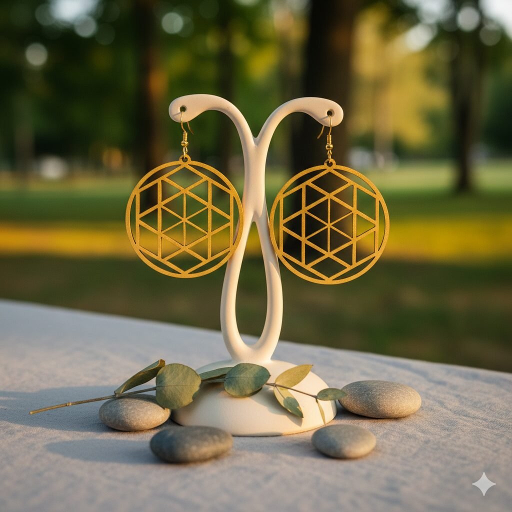 Chaque boucle d’oreille est méticuleusement découpée pour reproduire le motif intemporel de la Fleur de Vie. Réalisées en bois, elles sont incroyablement légères et confortables à porter.